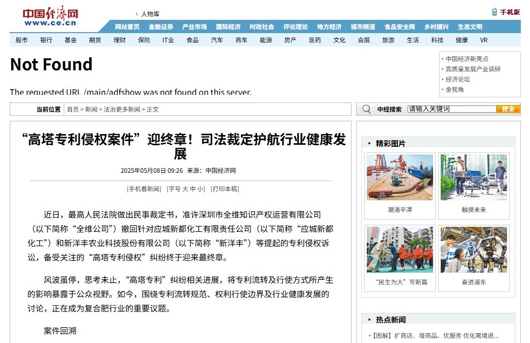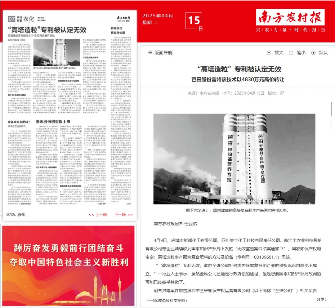 4 月 21 日,北京智慧財產法院發布《北京智慧財產法院 2025 年度案例》,從 2025 年生效的近 2.9 萬件案件中遴選出 10 件年度代表性案例,集中回應產業關切、明晰裁判規則、服務高質量發展。由三聚陽光代理的複合肥「問題專利」行政確權糾紛案,成功入選年度案例。北京智慧財產法院在發布會上表示,該批案例凸顯規則引領、產業規範與民生保障,著重透過典型個案細化裁判標準、契合行業發展需求。該案二審裁判要旨曾收錄於《最高人民法院智慧財產法庭裁判要旨摘要(2024)》。
