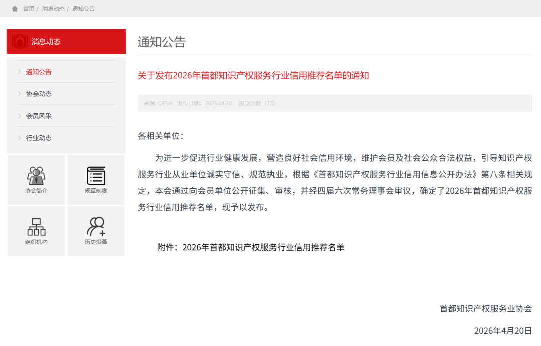 首都智慧財產權服務業協會於辦理 2026 年產業信用推薦作業時明確指出,信用推薦作業旨在進一步促進產業健全發展,引導智慧財產權服務業從業機構誠信經營、合法執業、提升服務品質,打造優質的社會信用環境。本次申報條件著重規範營運、信用紀錄、產業自律與長期服務能力等面向。該名單之公布,對於保障大眾合法權益、強化產業信用導向、推動智慧財產權服務業高品質發展,皆具正面效益。