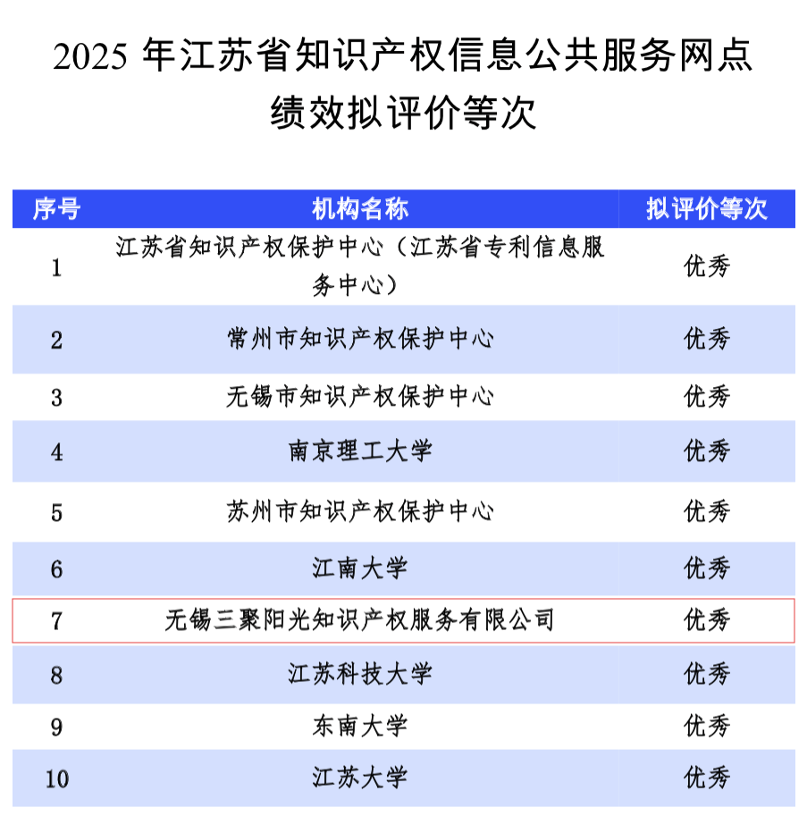 近日,江苏省知识产权局发布《2025年江苏省知识产权信息公共服务网点绩效评价结果公示》,无锡三聚阳光知识产权服务有限公司在本年度绩效评价中获评为“优秀”等次。这是继2024年度获评“优秀”等次之后,无锡三聚阳光再次在江苏全省绩效评价中名列优秀行列,显示出公司在知识产权信息公共服务领域持续稳定的服务能力与专业水准。