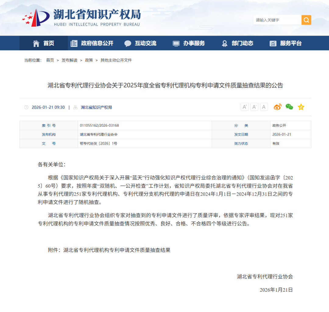 公告指出,本次抽查依据国家知识产权局“蓝天”行动相关要求,并结合年度“双随机、一公开检查”工作计划,由湖北省知识产权局委托湖北省专利代理行业协会组织实施;抽查对象覆盖在湖北从事专利代理的251家专利代理机构及分支机构,抽查范围为申请日介于2024年1月1日至2024年12月31日期间的专利申请文件,并按“优秀、良好、合格、不合格”四个等级公布结果。